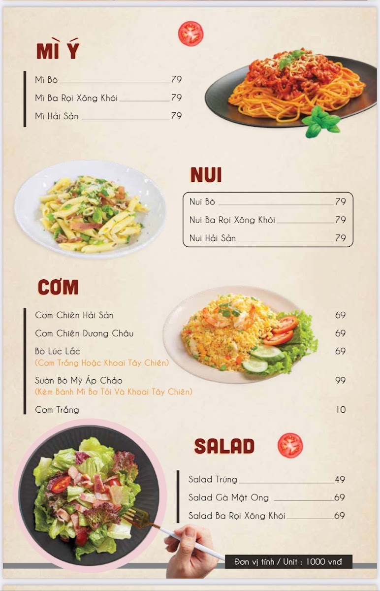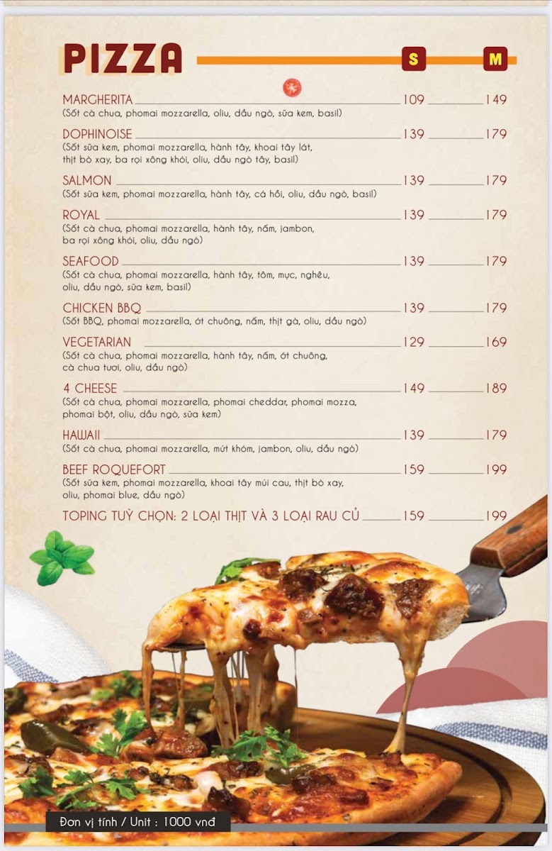 - Food: The culinary offerings are diverse, with options like tantalizing pizzas ranging from ₫109,000 to ₫199,000, hearty spaghetti and salads starting at ₫69,000, and classic fries and hamburgers for just ₫45,000.